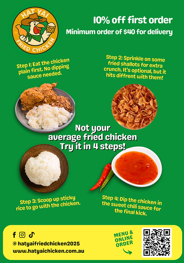 Whether it’s a quick meal, family dinner, or sharing with friends, Hatyai Fried Chicken is made to enjoy.